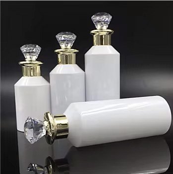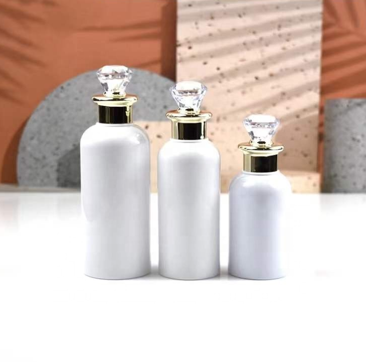 Ce flacon cosmétique luxe est fabriqué en plastique PET opaque avec un bouchon décoratif en acrylique et PP, offrant une présentation haut de gamme pour vos produits. Son design élégant avec bague dorée et tête effet cristal valorise immédiatement votre marque.