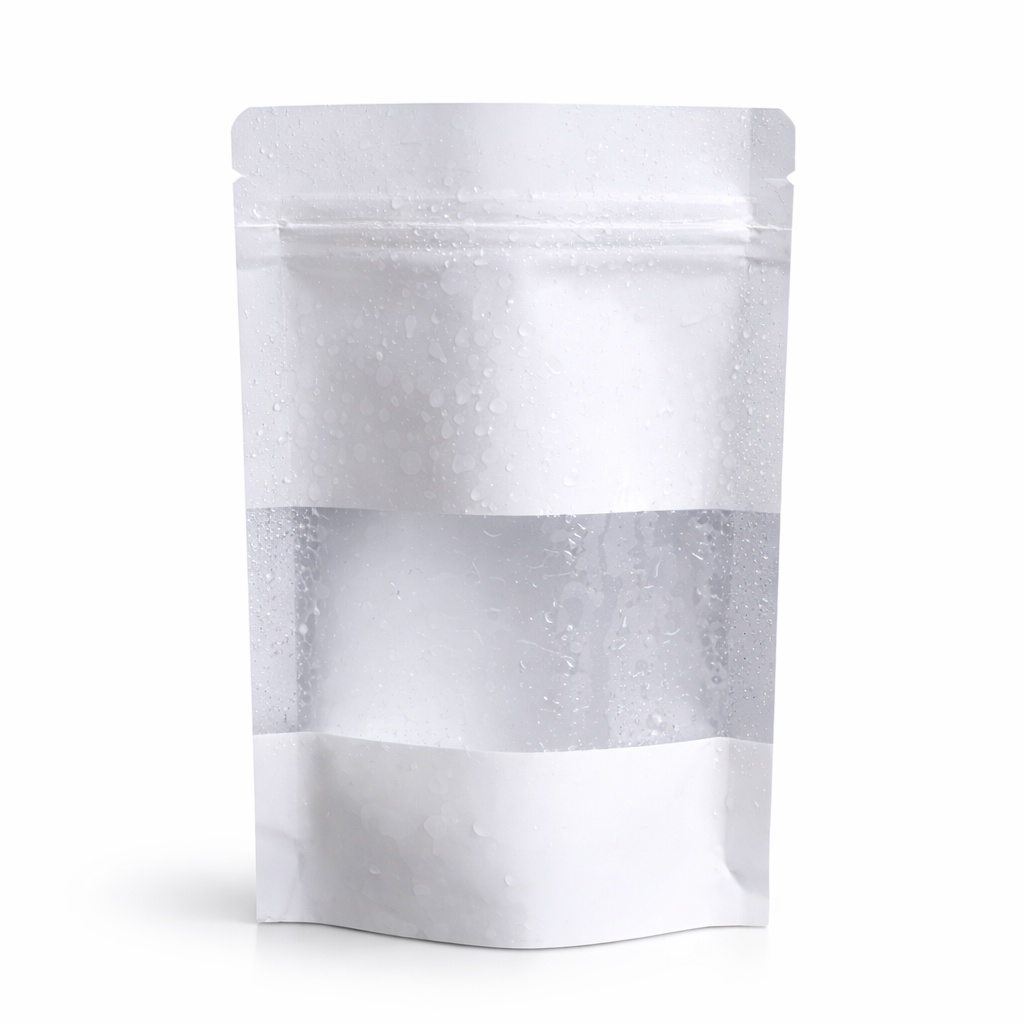 Ce doypack est fabriqué en plastique multicouche PET givré / PE alimentaire, offrant un rendu moderne et premium tout en protégeant le contenu contre l’humidité et l’air. Sa finition translucide laisse légèrement apparaître le produit.